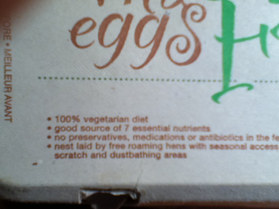 But chickens aren’t vegetarians. They’re meat eaters, omnivores. Are they telling us that the chickens aren’t eating other chickens or cows? That’s good. But they should be scratching for bugs, etc, because a diet that includes bugs makes their eggs very healthy and great for cooking. It’s probably good for the health of the chicken that unfortunately ends up on a plate, too.