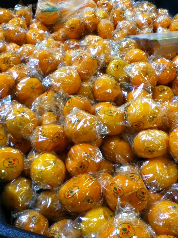 The individually wrapped oranges are mystifying – and at least that’s an anomaly in Canada and the US. In Japan, fruit regularly comes in individual styrofoam girdles. Or, if you want even more packaging, you can get boxes of identical fruit in girdles.