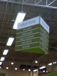But these signs hang over only two aisles. To be fair, the store does have the organic fruits and veggies in the veggies section but as for the rest of the store….if only these two aisles are ‘natural foods’ what’s in all the rest of the aisles?!